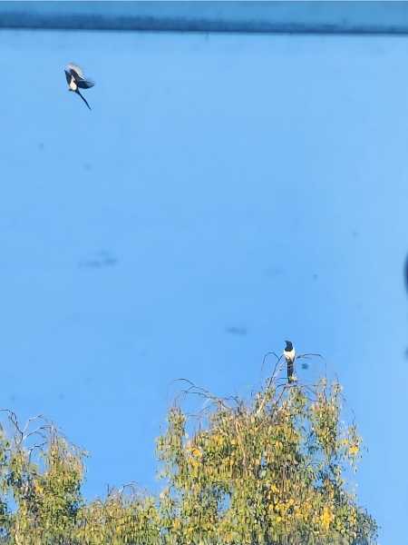 In der Birke hinter der Häuserzeile, die wir von unserem Garten aus sehen, versammeln sich die Stare. Jedes Jahr staunen wir wieder, wieviele Hunderte von ihnen auf dieser Birke hocken können. Heute sind sie noch lange nicht komplett. Außerdem sind da ein paar Elstern, die meinen, Vorrechte zu haben. Es ist lustig anzusehen, wie die Besetzung auf dem Baum wechselt und unter welchen Umständen.
