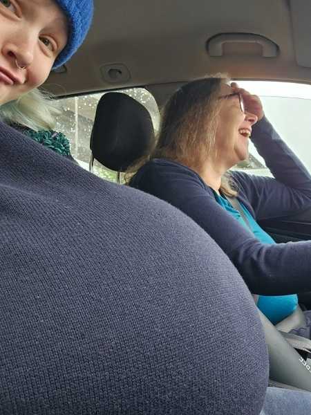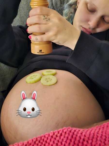 Anne hat nicht so eine leichte Schwangerschaft, wie sie mir vor 23 Jahren vergönnt war: Schon zu Beginn ist ihr furchtbar schlecht, sie hat viele körperliche Beschwerden, und schon zwei Monate vor dem Tag aller Tage kann sie sich nur noch äußerst behäbig bewegen. Alles schmerzt, und ich fahre und begleite sie zu den meisten Zielen. Vorübergehend stelle ich meine Termine zurück und kümmere mich mit Freude und Geduld um meine Lieblingstochter. Zu meiner Freude weiß sie es zu schätzen, und wir haben viele richtig schöne Gespräche, in denen wir planen, gestalten, spinnen und viel lachen. Unter anderem über diesen riesigen Bauch, den Anne gern in Szene setzt.